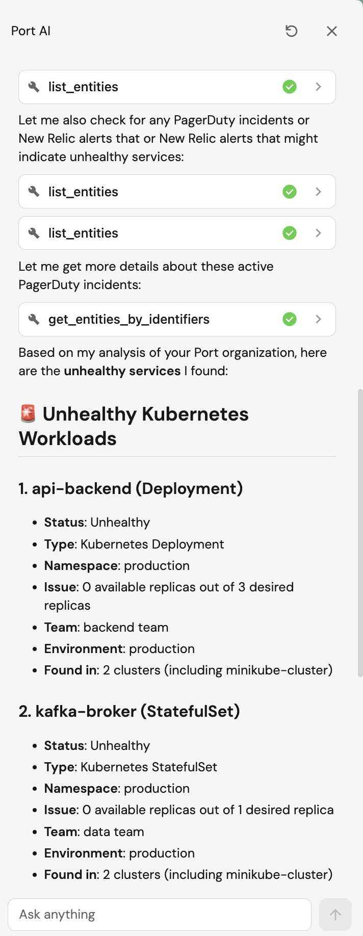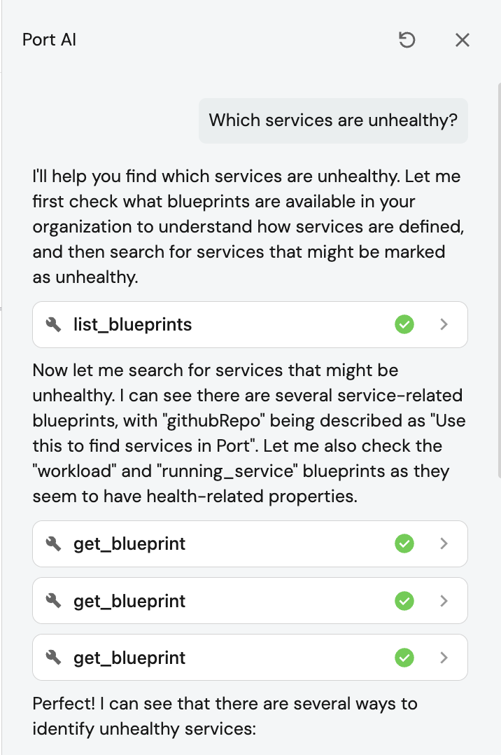 • Comprehensive knowledge: Understands your catalog, actions, and Port documentation.
