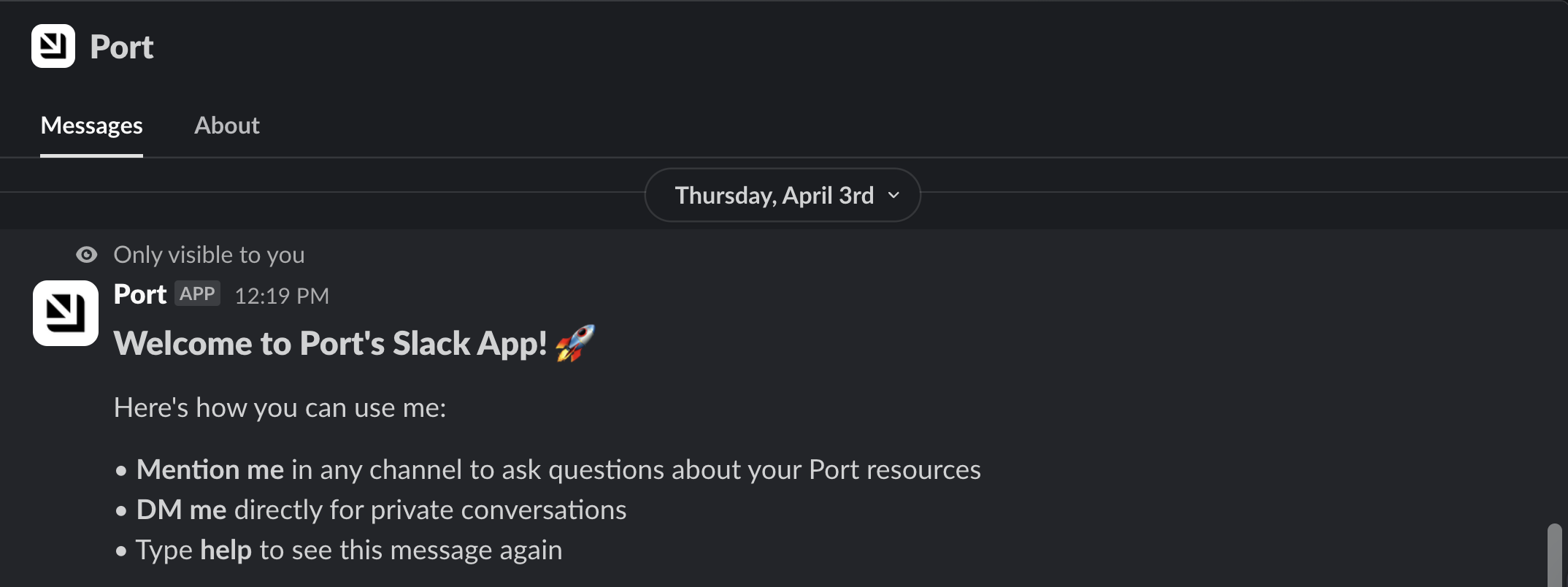 Once installed, you will receive a Slack message from Port's bot with a summary of the app's capabilities: