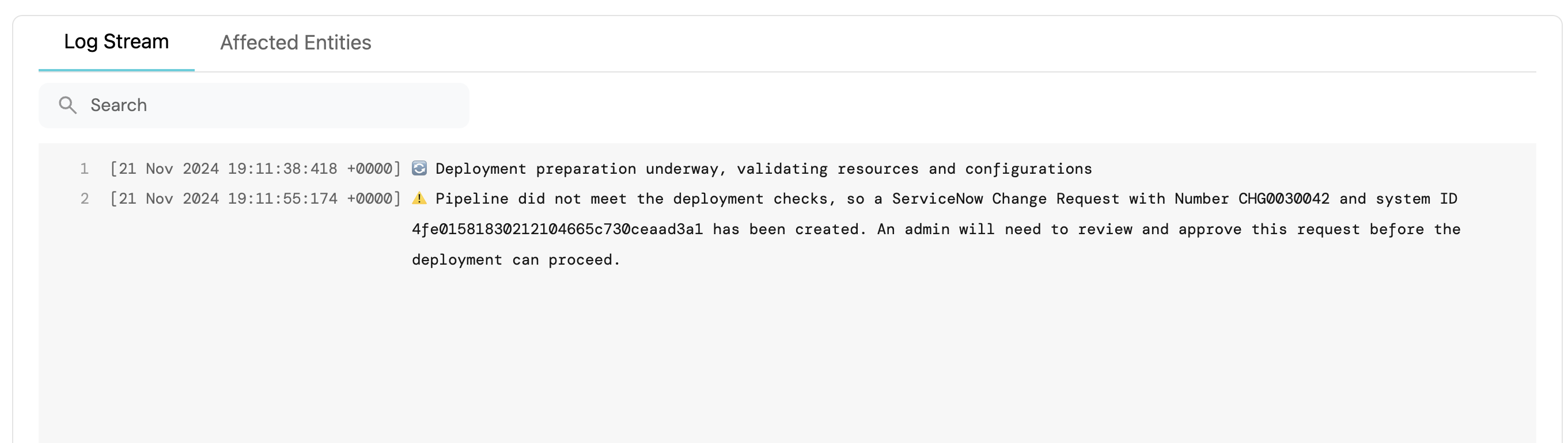 logMessage="โš ๏ธ Pipeline did not meet the deployment checks, so a ServiceNow Change Request with Number $changeNumber and system ID $changeSysId has been created. An admin will need to review and approve this request before the deployment can proceed."