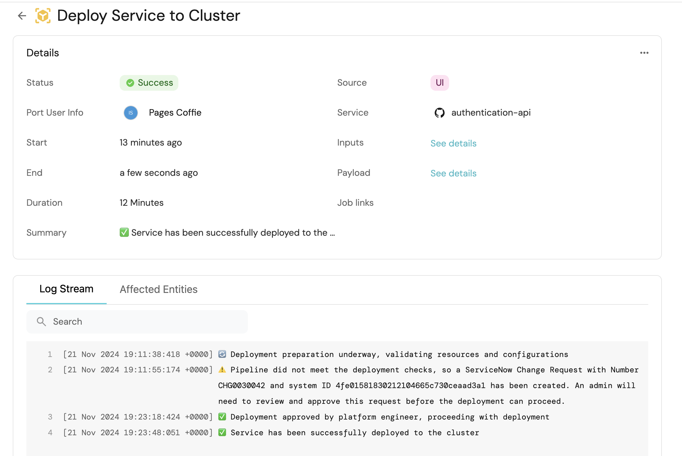 • CR decisions in ServiceNow UI trigger Port automation to update the pipeline.